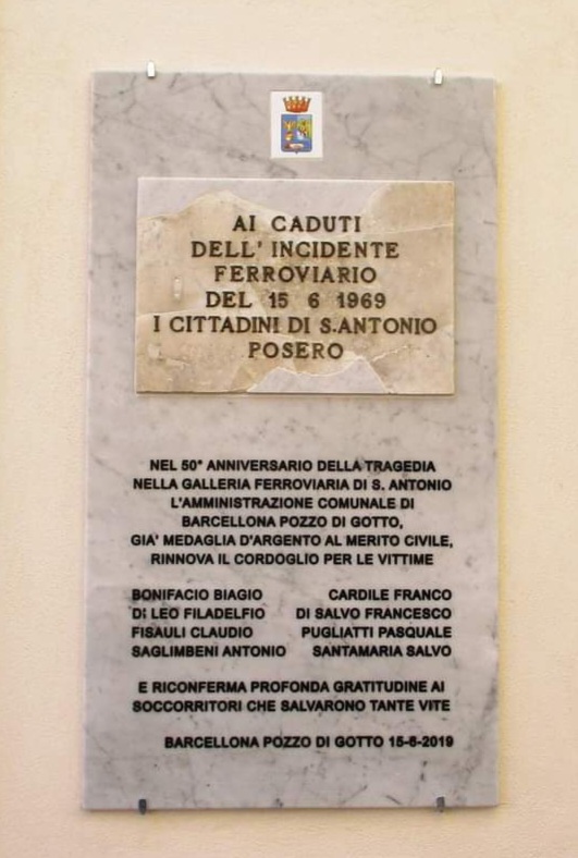 Quel maledetto 15 giugno 1969 nella galleria di Sant’Antonio, a seguito di un impatto tra due convogli, morirono ben otto persone e vi furono parecchi feriti. A questa tragedia che è rimasta nella storia della città del Longano l’Esperto del Sindaco Materia, il Prof. Gaetano Mercadante insieme all’allora Assessore Avv. Antonio Raimondo, nel 2019 ovvero in occasione del 50esimo anniversario, dedicarono sia la realizzazione di una nuova stele in cui fu incastonata la vecchia targa danneggiata, sia una mostra di giornali d’epoca, materiale personale di Mercadante recuperò girando per la Sicilia. Il Museo Etnoantropologico “Cassata” offrì i suoi cimeli ferroviari d’epoca.