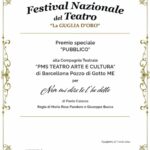 Si tratta di una fra le più importanti  rassegne d’Italia e la compagnia barcellonese dopo essere stata selezionata fra le 66 richiedenti e dopo aver messo in scena lo spettacolo lo scorso 3 marzo 2024,  nella serata di premiazione del 17 marzo 2024, alla presenza della nota Emanuela Aureli, ha conseguito i seguenti premi: 1)  Premio del Pubblico – 2) Premio migliore attore Protagonista assegnato a Cosimo Santangelo – 3) migliore scenografia