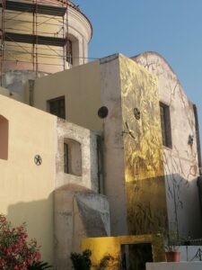 Sulla parete esterna della chiesa l’Arcangelo Michele viene raffigurato mentre scaccia i demoni dal paradiso, i quali cadono in mare diventando naufraghi di questo mondo. I demoni verranno poi salvati da una Galatea, ninfa del mare e protettrice dei naviganti. L’unione di un soggetto sacro e uno pagano pone in evidenza la bivalenza spesso richiamata da Weik nelle sue opere.”