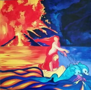 Nello specifico il dipinto che rappresenta Galatea  e il vulcano “Iddu” ( olio su tela, 70X70, del 2021 ) è omaggio al Divin Pittore Raffaello Sanzio ed al territorio siciliano, all’isola di Stromboli, ad una delle magiche  sette sorelle, l’arcipelago delle Eolie. La Galatea di Angela Saja non è solo Nereide del mare, è anche figlia di un’isola da cui non fugge, fatta con la stessa materia di Iddu, ma sul carro trainato da delfini solca il mare metafora del futuro.