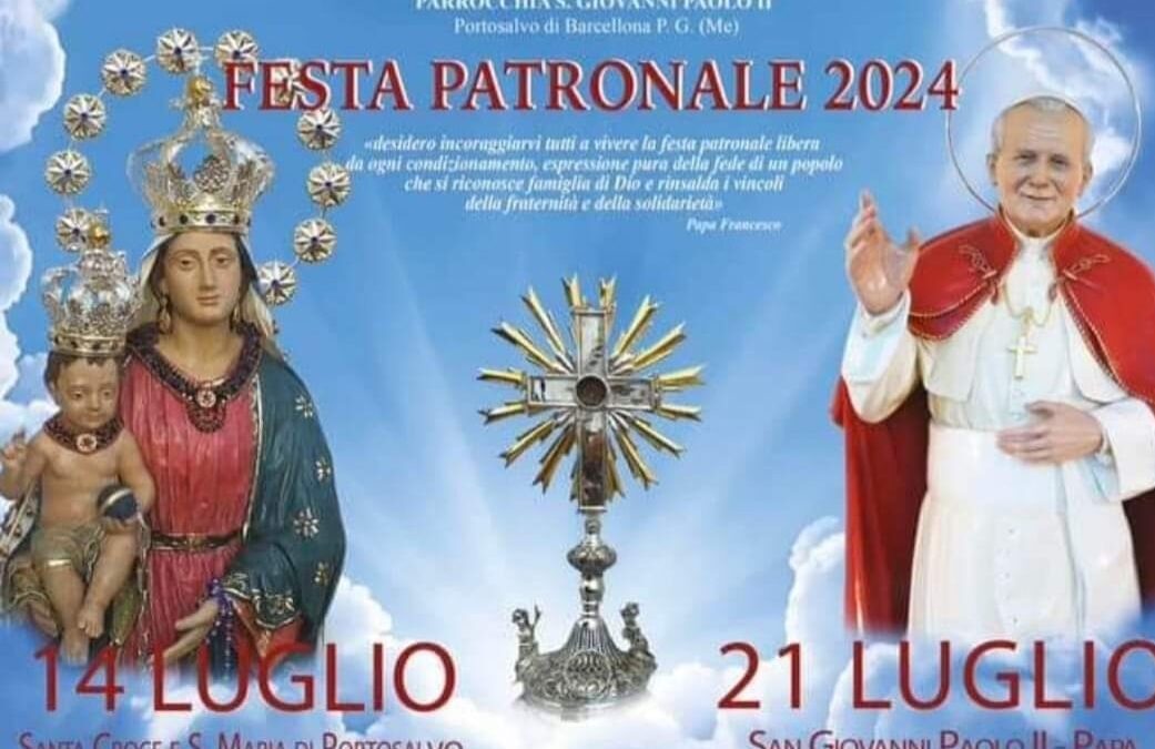 Entra nel vivo la Festa Patronale 2024 nella Parrocchia di Porto Salvo, frazione collinare del comune di Barcellona Pozzo di Gotto e già domenica scorsa, 14 luglio, si è tenuta la Solenne Processione della Santa Croce e di S. Maria di Porto Salvo. Adesso ci si prepara alla giornata che vedrà protagonista San Giovanni Paolo II, che culminerà domenica 21 con la Solenne Processione delle ore 18.00.