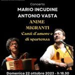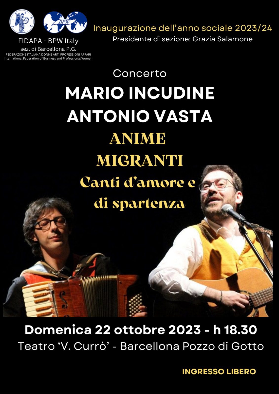 Si riparte alla grande con le attività della Fidapa BPW-Italy sezione di Barcellona Pozzo di Gotto guidata dal nuovo Direttivo che vede Presidente la Dott.ssa Grazia Salamone e domenica 22 ottobre presso il Teatro “Vittorio Currò” dell’Oratorio Salesiano “San Michele Arcangelo” alle ore 18.30 si terrà il concerto di Mario Incudine e Antonio Vasta “Anime Migranti. Canti d’amore e di spartenza”.