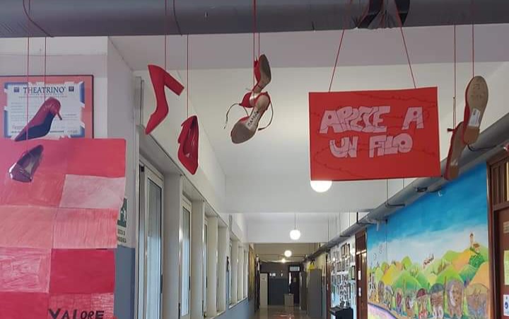 Nell’ambito del progetto ‘Pari Opportunità’ coordinato dalla prof.ssa Lara Alesci e a conclusione di un’intera settimana dedicata nelle classi a lettura di testi, visioni di video e spot, elaborazione di articoli sul tragico e ormai quotidiano fenomeno dei femminicidi e della violenza di genere – senza dimenticare l’attuale protesta delle donne iraniane e la negazione della cultura e dell’istruzione femminile in molte parti del mondo – l’articolata performance dal titolo “Appese a un filo” ha impegnato tutti gli alunni ad esprimersi attraverso il linguaggio artistico e grafico scegliendo nuovi simboli oltre alle classiche scarpe rosse in ricordo delle donne che non ci sono più.