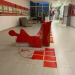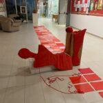 Queste ultime hanno anzi assunto un altro significato, appese numerose a fili rossi nell’androne della scuola quale metafora della precarietà che incombe sull’esistenza di molte donne. Con un innovativo accostamento ideale e simbolico, poi, una originale installazione grafico-artistica guidata dai docenti di arte Sabina Bruzzese, Felice Trimboli e Giuseppe Orlando, ha visto alcune sagome avvolte da fili rosso sangue ergersi davanti alla Biblioteca Arcobaleno e all’ingresso del Museo Didattico Foscolo, dal quale un tappeto composto da tanti fogli colorati in varie tecniche dai ragazzi, alternati ad altri con le parole espressione di violenza, doveva arrivare nella piazza antistante la scuola e fare da scenario ad un corteo di protesta e a una emblematica danza liberatoria sulle note della canzone “Baraye” di Shervin Hajipour, dedicata a Mahsa Amini e alle donne iraniane.
