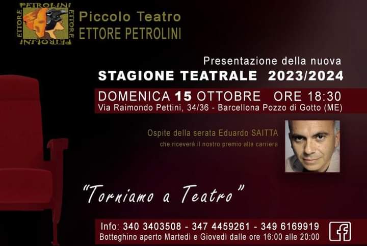“TORNIAMO A TEATRO” è il significativo titolo che annuncia l’evento di domenica 15 ottobre 2023 alle 18:30 presso il Piccolo Teatro Petrolini di Barcellona Pozzo di Gotto. Francesco Chianese e tutta l’Associazione Teatrale “Ettore Petrolini” invitano i cittadini alla presentazione della Stagione Teatrale 2023/2024.