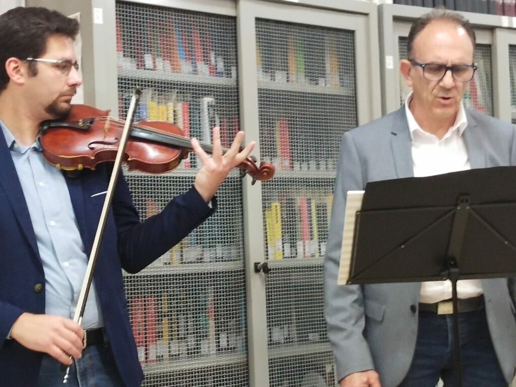 La presentazione ha preso avvio con l’esibizione di due componenti del gruppo “Patriots” la nota Tribute Band di Franco Battiato che tanto successo sta riscuotendo negli ultimi tempi: il cantante e leader Sonny Foschino, accompagnato dal violino di Valerio La Torre, ha eseguito una toccante versione del brano “Vitti ‘na Crozza”, la 34esima versione della nota canzone (abbiamo infatti scoperto che ne sono state realizzate ben 33) che ha fatto spellare le mani ai presenti.