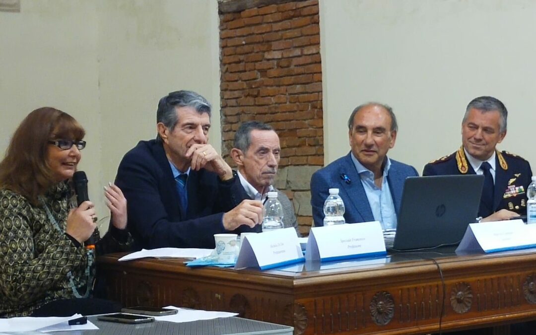 Al tavolo dei relatori anche il Dott. Antonio Molinaro, Primo Dirigente della Polizia di Stato, Reparto Volo, con il suo vice seduto in prima fila. Una menzione speciale per l’artista Gaetano Porcasi, “Pittore della Storia”, che si è brevemente collegato telefonicamente e del quale meravigliose ed incisive opere erano presenti in Auditorium.