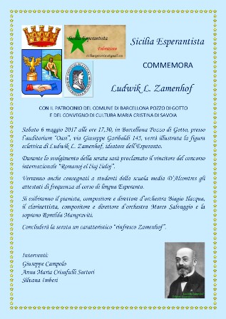 Importante evento sabato 06 maggio 2017 a Barcellona Pozzo di Gotto (ME): alle ore 17,30 presso l’Auditorium “Oasi” di Via G. Garibaldi, 145, verrà illustrata la figura dell’eclettico Ludwik L. Zamenhof, ideatore dell’Esperanto. Sono previsti interventi di Giuseppe Campolo, Anna Maria Crisafulli Sartori e Silvana Imbesi.