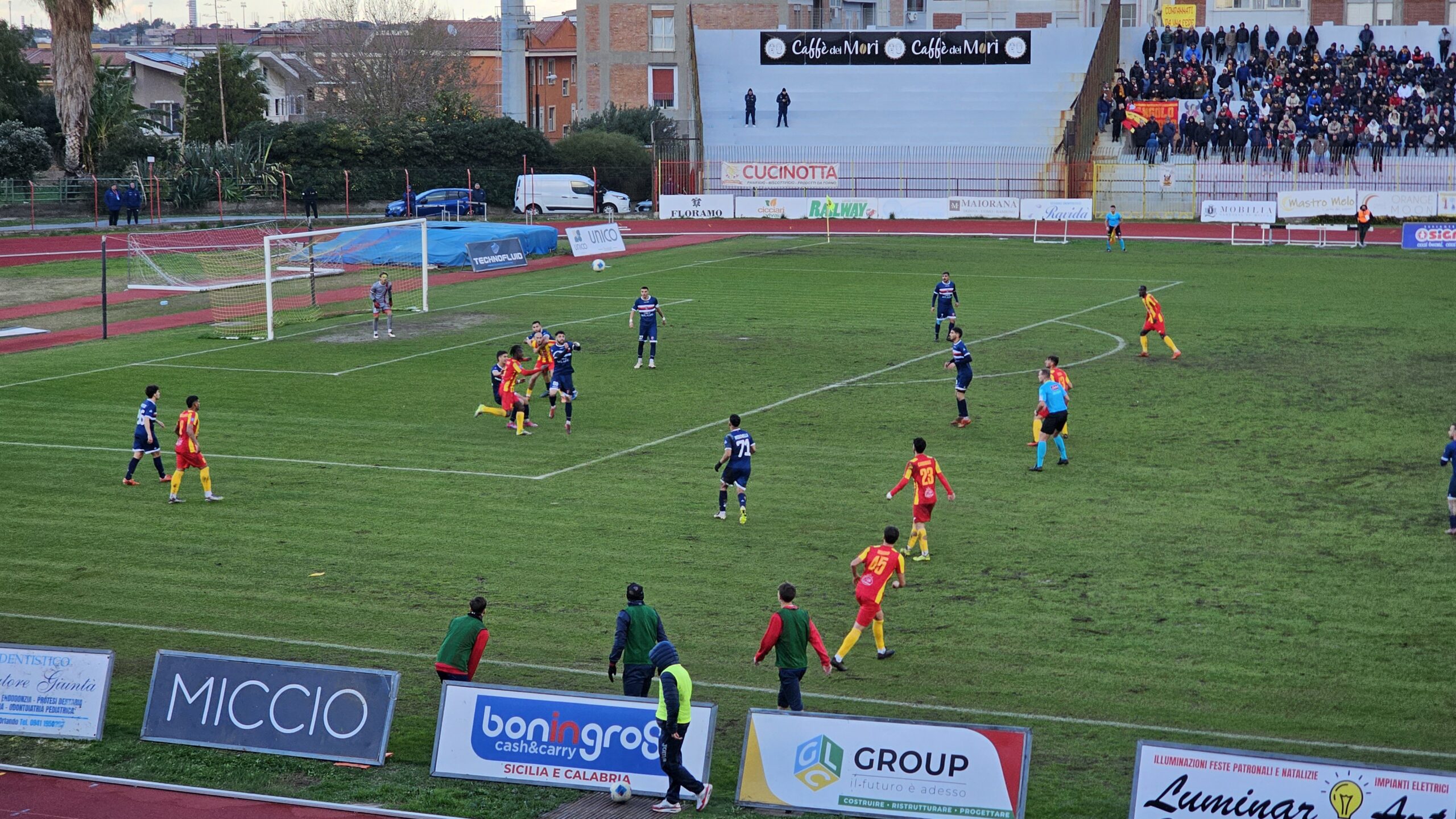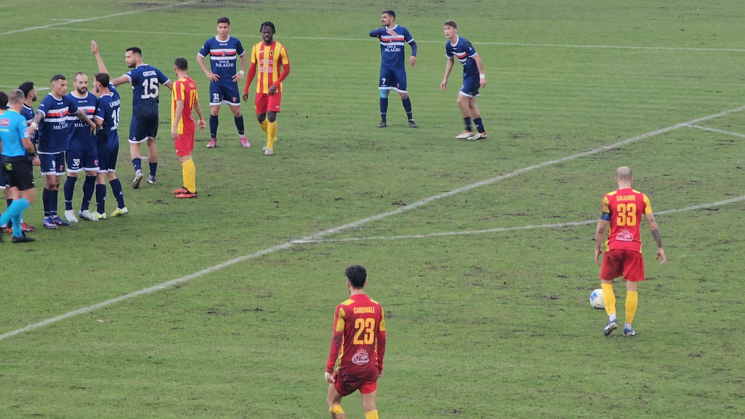 Al 40′ la palla al centro area di Joao Pedro ci crede il bomber Samake che dopo il primo rimbalzo e la titubanza della difesa ospite anticipa Mileto e infila di testa per il vantaggio dei giallorossi. Esplosione di gioia in gradinata e tribuna tra cori e sfotto’ contro i ‘cugini’ milazzesi.