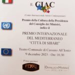 Sabato 9 dicembre 2023 alle ore 18.30 presso il Teatro Comunale di Cassano all’Ionio in provincia di Cosenza, si terrà il Premio Internazionale del Mediterraneo “Città di Sibari”, Premio della Cultura della Presidenza del Consiglio dei Ministri, organizzato dal CIAC (Centro Internazionale Artisti Contemporanei) presieduto da Pino Chiovaro.