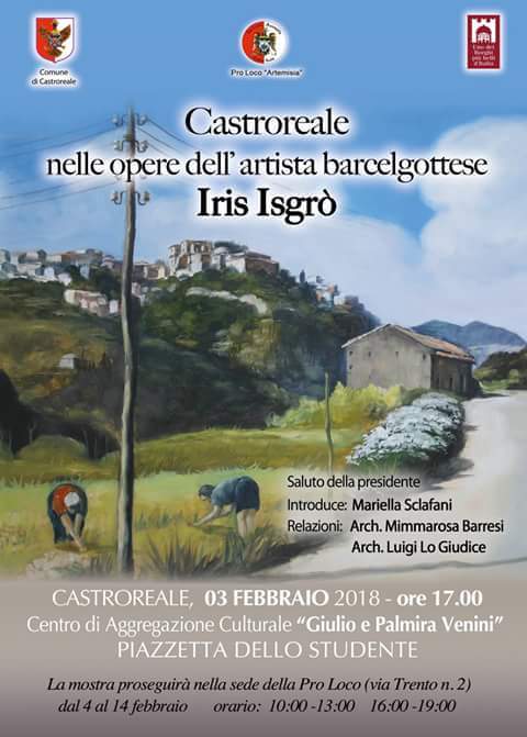 Sabato 3 febbraio 2018 alle ore 17,00 presso il Centro di Aggregazione Culturale “Giulio e Palmira Venini” – Piazzetta dello Studente di Castroreale, uno fra i Borghi più belli d’Italia, in provincia di Messina, si terrà la presentazione dell’evento “Castroreale nelle opere dell’artista barcelgottese Iris Isgrò”.
