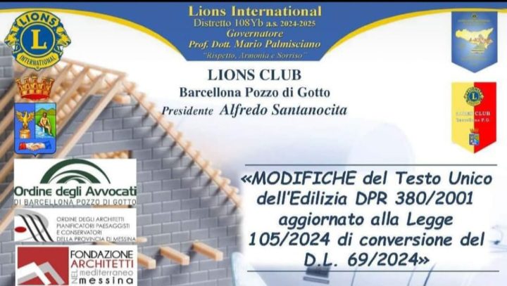 Nel pomeriggio di oggi, venerdì 11 ottobre 2024, si terrà presso la Sala Congressi del Parco “Maggiore La Rosa” un importante Convegno organizzato dal Lions Club Barcellona Pozzo di Gotto presieduto dall’Avv. Alfredo Santanocita, dal titolo “Modifiche del Testo Unico dell’Edilizia DPR 380/2001 aggiornato alla Legge 105/2024 di conversione del D. L. 69/2024.