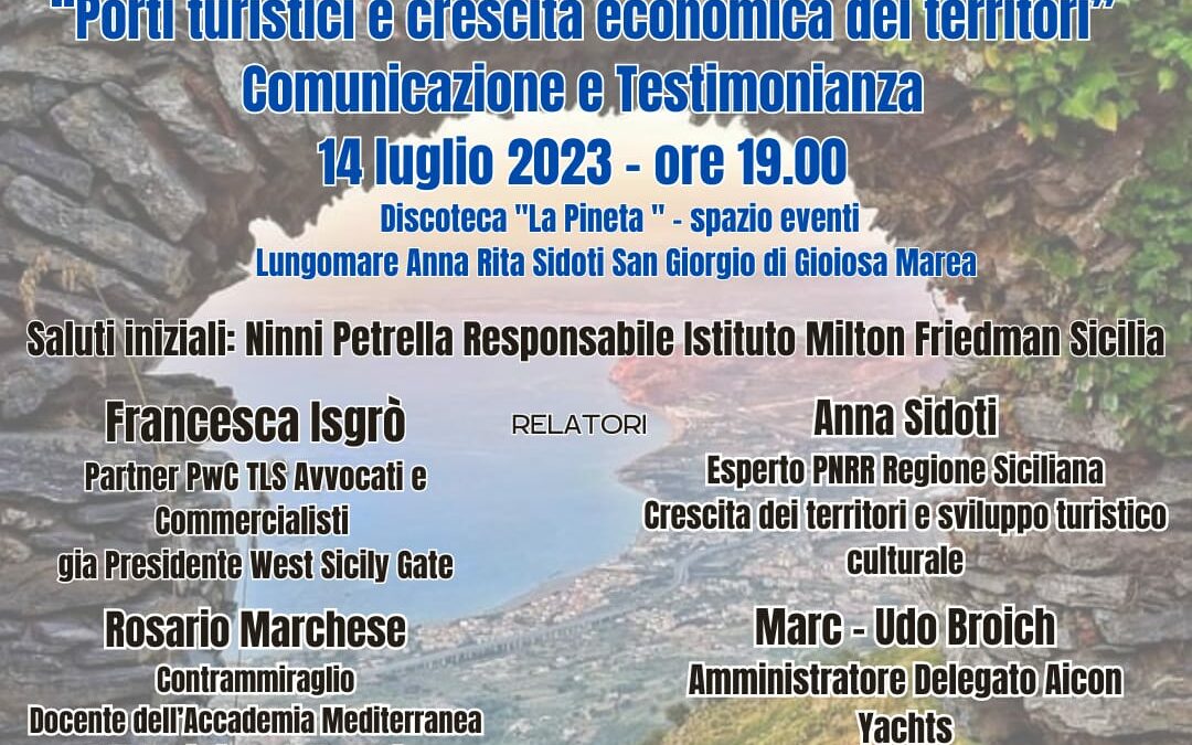Si terrà venerdì 14 luglio 2023, alle ore 19:00, presso lo spazio eventi della discoteca “La Pineta”, sul Lungomare Anna Rita Sidoti di San Giorgio di Gioiosa Marea (ME), il convegno dal titolo “Porti turistici e crescita economica dei territori. Comunicazione e testimonianze”, organizzato dall’Ing. Anna Sidoti, Responsabile dello Sviluppo dell’Istituto Milton Friedman per la Città di Patti e l’area dei Nebrodi.
