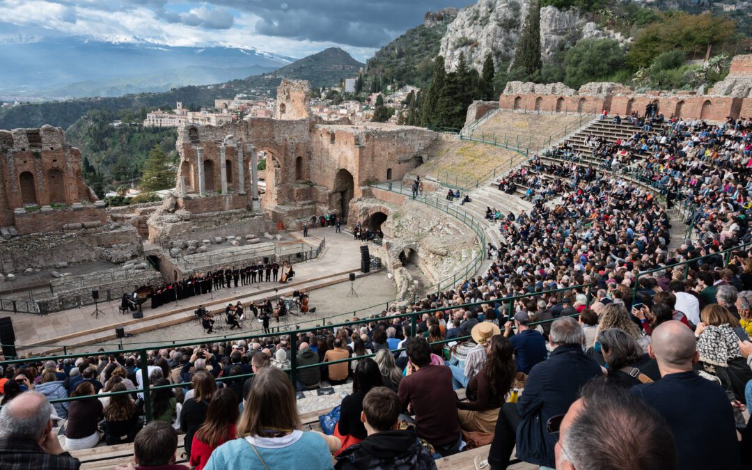 Neanche la pioggia ha fermato l’entusiasmo del pubblico intervenuto numerosissimo il 4 gennaio al Teatro Antico di Taormina per assistere al nuovo format del Concerto di Capodanno organizzato dal prestigioso Coro Lirico Siciliano, fondato e guidato da due musicisti e operatori culturali di alto spessore come Francesco Costa e Alberto Munafò Siragusa, rispettivamente direttore artistico e presidente.
