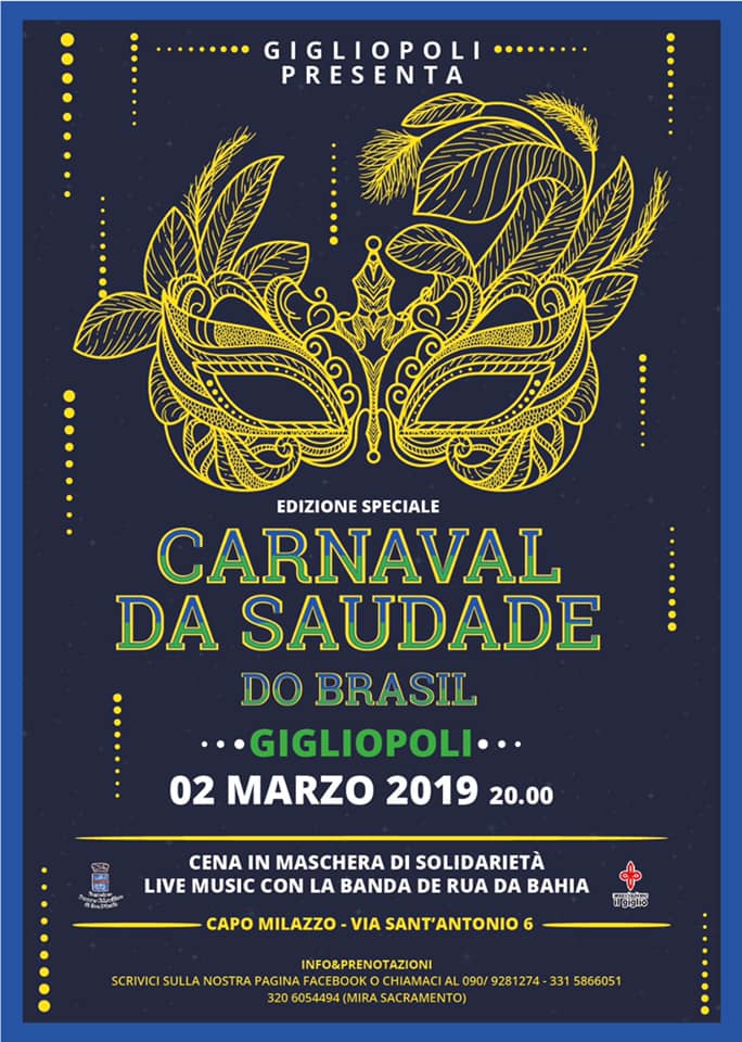 Il primo degli eventi è la prima e speciale edizione del “Carnaval da Saudade do Brasil” che si terrà il prossimo 2 marzo 2019 dalle ore 20.00. Si tratta di una cena di ruolo, il cui obiettivo è sostenere il progetto Gigliopoli. Dedicata agli adulti, alle famiglie ed anche ai bambini, la serata in maschera ruoterà attorno alla magica atmosfera brasiliana. Donne in bianco, rievocative delle Oshun o Oxum accoglieranno gli ospiti, personificando quelle che, per la tradizione antica brasiliana e per il culto tipico del luogo, erano le semidivinità che regnavano su amore, fiumi, salute, diplomazia, fertilità, ricchezza, benessere e bilancio. Immersi in questa atmosfera vitale, tipica dei brasiliani di origine e non in maschera che apriranno le porte di Gigliopoli, si potrà gustare una cena tipica messa a punto per l’occasione da chef Enzo con Jana e Mira. Una cena brasiliana, ma rivisitata in chiave gigliopolana e quindi vegetariana, solleticherà le papille gustative di chi deciderà di donare la propria allegria a sostegno di una causa, quale quella che l’Associazione “Il Giglio” in partenariato con la Fondazione “G. Lucifero” portano avanti da anni.
