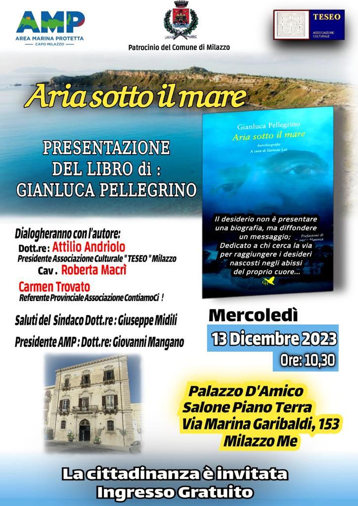 “Aria sotto il mare” è il titolo del libro di Gianluca Pellegrino, edito da Giovane Holden Edizioni, che verrà presentato mercoledì 13 dicembre 2023, a Milazzo nel salone a piano terra di Palazzo D’Amico in Via Marina Garibaldi 153 alle ore 10.30.