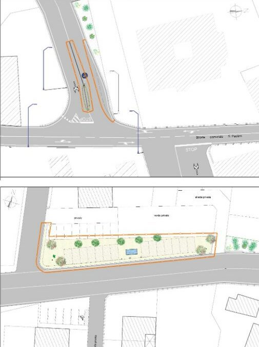 L’area di intervento 1 è individuata in prossimità della bretella di raccordo proveniente dall’asse viario con la Strada Comunale San Paolino. In tale zona sono state individuate due sotto-aree di intervento: la prima a circa 80 metri dall’intersezione della bretella di raccordo dell’asse viario con la viabilità comunale, su un lotto di proprietà comunale attualmente in disuso, ai margini della carreggiata. Si prevede la realizzazione di un parcheggio per la sosta delle autovetture, previa pavimentazione della superficie pubblica in masselli autobloccanti su letto di sabbia di origine alluvionale. Gli stessi saranno alternati con prato strutturale realizzato con masselli grigliati su letto di appoggio costituito da sabbia e terriccio necessari al fine di garantire un adeguato inerbimento delle superfici a vista. La scelta di tale tipologia di pavimentazione deriva dalla necessità di mantenere inalterato il grado di permeabilità dell’area, ricorrendo a sistemi drenanti altamente efficienti. L’area sarà ultimata mediante collocazione di elementi arredo urbano quali panchine, fioriere, e una pensilina con seduta per l’attesa confortevole dei mezzi pubblici.