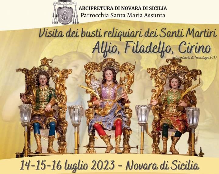 Grande attesa a Novara di Sicilia ed in tutto il territorio per l’arrivo, venerdì 14 luglio 2023 alle ore 18.00 in Piazza Stancanelli Basile, dei busti reliquiari dei Santi Martiri Alfio, Filadelfio e Cirino, provenienti dal Santuario di Trecastagni (Ct). Ogni anno, in occasione della Festa loro dedicata, giungono nel centro della provincia di Catania migliaia di fedeli da tutta la Sicilia e anche da altre regioni a rendere onore ed a pregare i tre fratelli Santi.