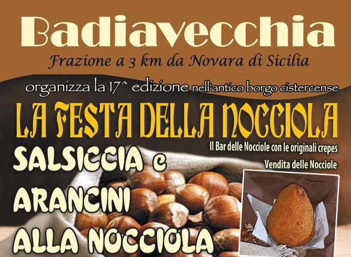 Torna sabato 5 e domenica 6 ottobre a Badiavecchia, antico borgo cistercense a 3 km da Novara di Sicilia, la 17^ Edizione Festa della Nocciola 5 e 6 Ottobre 2024: unica, esclusiva, originale per la sua salsiccia con le nocciole, per i buonissimi arancini alla nocciola e domenica, a pranzo, pasta al ragù di cinghiale e tantissimi dolci.