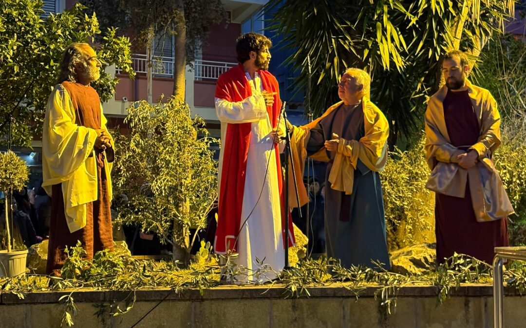 Davanti alla chiesa, l’immagine era potente: decine di figuranti, adulti e bambini, uniti in un’unica visione. Un mosaico umano che raccontava appartenenza, dedizione, radici. Poi il racconto ha preso corpo, scena dopo scena, accompagnato da voci fuori campo capaci di guidare il pubblico dentro un percorso di sofferenza e redenzione. Fino all’ultimo atto, la crocifissione: un momento sospeso, quasi irreale, in cui il tempo si è fermato per lasciare spazio solo alla commozione.