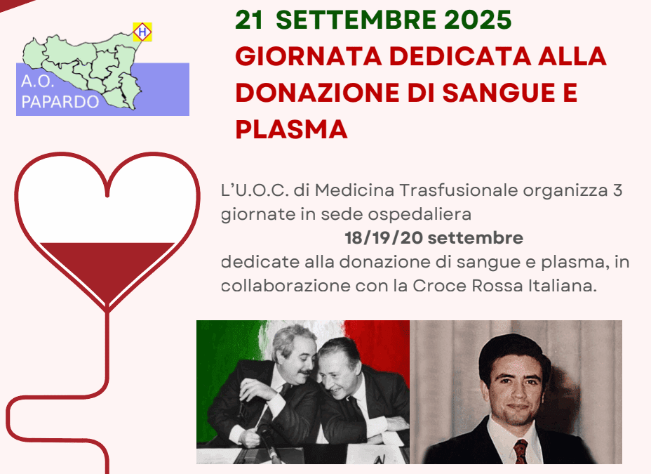 L’Azienda Papardo, per il tramite della UOC di Medicina Trasfusionale, per tale occasione rganizza un open day presso la UOC di Medicina Trasfusionale (Plesso A terzo piano) nei giorni 18/19/20 settembre dalle ore 08.30 alle ore 13.30, in collaborazione con la Croce Rossa Italiana sezione di Messina. Le giornata saranno dedicate alla sensibilizzazione e donazione di sangue e plasma ed al reclutamento di nuovi donatori grazie anche al supporto delle associazioni.