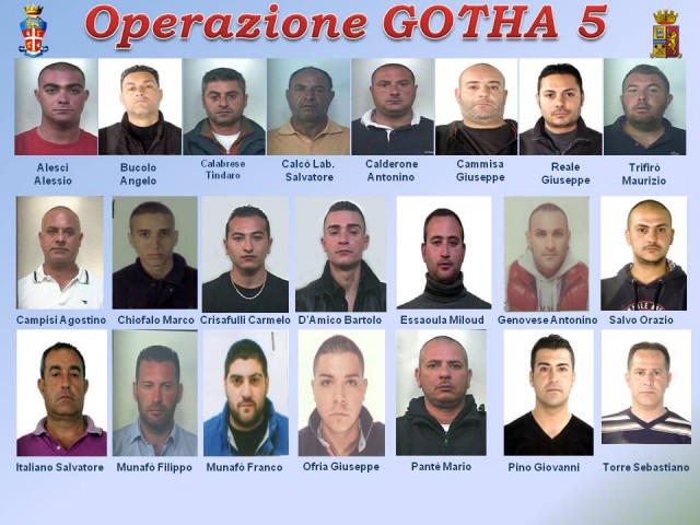 L’operazione ha portato all’arresto di 22 soggetti per associazione mafiosa, estorsioni, rapine, porto abusivo di armi ed altri reati contro la persona e il patrimonio. Altre 5 persone sono state indagate e denunciate in stato di libertà per gli stessi reati nell’ambito di quella che è stata chiamata operazione “GOTHA V”, che deve il suo nome all’azione di individuazione che ha colpito i nuovi assetti del sodalizio criminale, già duramente provato dagli esiti dell’operazione “GOTHA IV”.