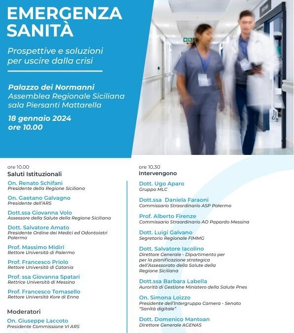 Al convegno “Emergenza Sanità – Prospettive e soluzioni per uscire dalla crisi” interverranno il Presidente della Regione Renato Schifani, Il Presidente dell’ARS Gaetano Galvagno, l’Assessore Regionale alla Salute Giovanna Volo, il Direttore Generale dell’Agenzia Nazionale per i Servizi Sanitari Regionali Domenico Mantoan, il Presidente dell’Ordine dei Medici ed Odontoiatri di Palermo Salvatore Amato, i rettori delle Università di Palermo, Catania, Messina ed Enna Massimo Midiri, Francesco Priolo, Giovanna Spatari e Francesco Tomasello.
