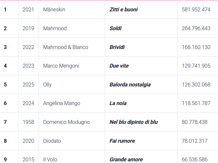 In cima alla classifica domina Zitti e buoni dei Måneskin (2021), con oltre 580 milioni di ascolti, seguita da Soldi di Mahmood (2019) e Brividi di Mahmood e Blanco (2022). Tra i brani più ascoltati figurano anche Due vite di Marco Mengoni, La noia di Angelina Mango e Balorda nostalgia di Olly, vincitrice dell’ultima edizione del Festival.