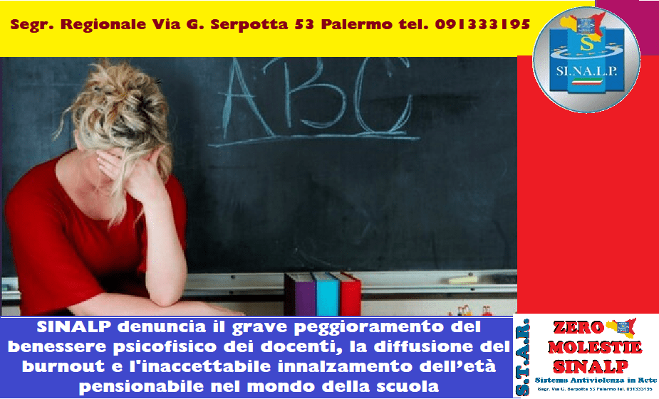 Il Segr. SINALP Sicilia Dr. Andrea Monteleone e il Delegato Scuola, Prof. Giuseppe Lombardo, richiamano con fermezza l’attenzione delle istituzioni e dell’opinione pubblica sulle sempre più critiche condizioni psicofisiche che stanno colpendo il personale docente, mettendo a rischio la qualità stessa del sistema educativo.