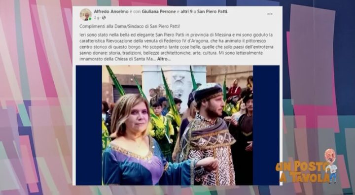 Molto interessante poi la partecipazione alla cena del sindaco di San Piero Patti Cinzia Marchello alla quale il conduttore ma anche gli altri due ospiti hanno fatto i complimenti per la recente Rievocazione Storica della venuta di Federico IV d’Aragona a San Piero Patti, nella quale la stessa è stata parte attiva rappresentando una Dama in meraviglioso costume d’epoca. Soddisfazione personale che un mio post con la foto della “sindaca in corteo” corredata da un commento sia stata riproposta da Franco Arcoraci, che ringrazio, insieme alla citazione delle mie dirette dell’evento.