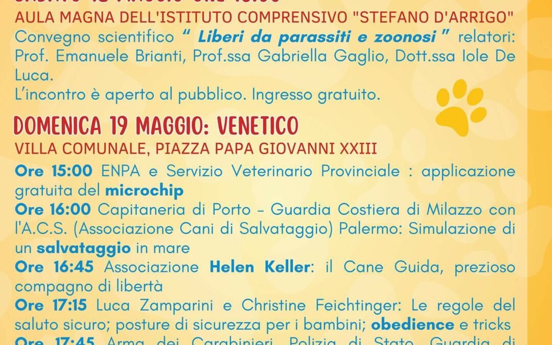 Tutto pronto per il DOGDAY2024, evento organizzato dall’Associazione Hermes Milazzo Onlus con il patrocinio del Comune di Venetico e in stretta collaborazione con la Capitaneria di Porto – Guardia Costiera di Milazzo, dalla Lega Navale  Sez. di Milazzo, dall’Associazione Mare Vivo, dall’Associazione Cani Salvataggio di Palermo, che si terrà domenica 19 maggio 2024 a Venetico.